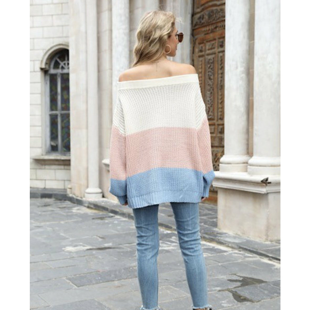 Details: Striped Oversize Sweater with Off the Shoulder Neckline.