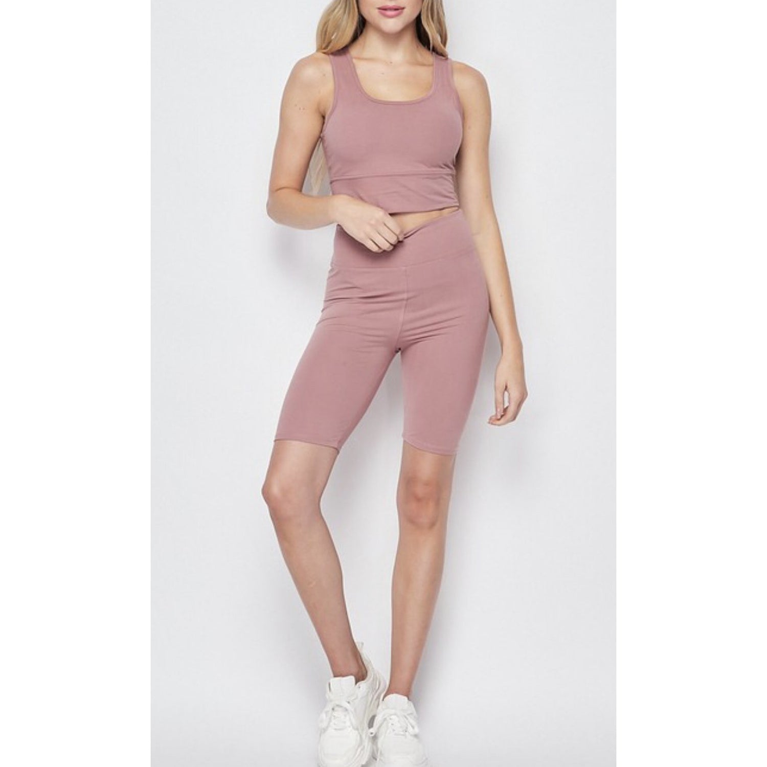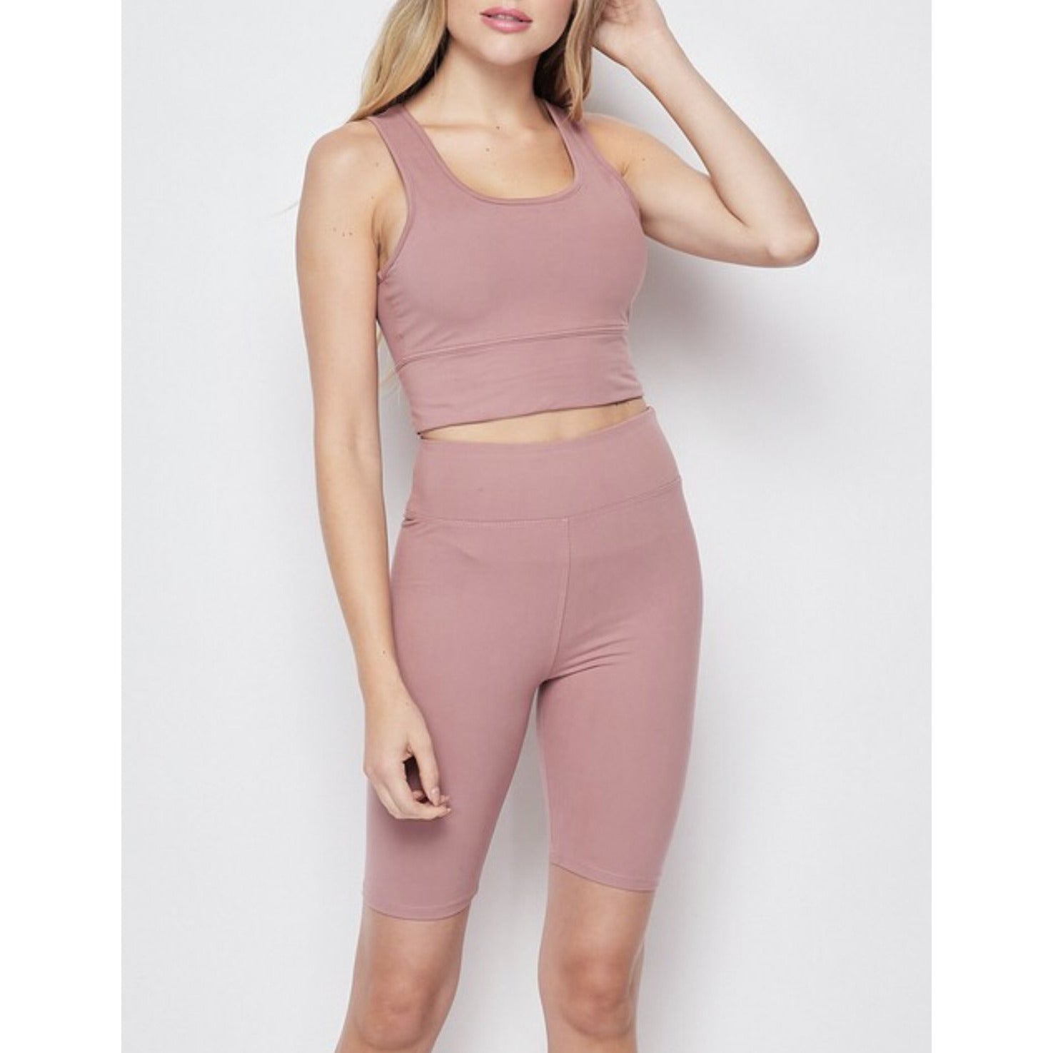 Details: Soft stretch knit sports bar featuring scoop neckline, elastic waistband, and removable pads. Comes with long length shorts.