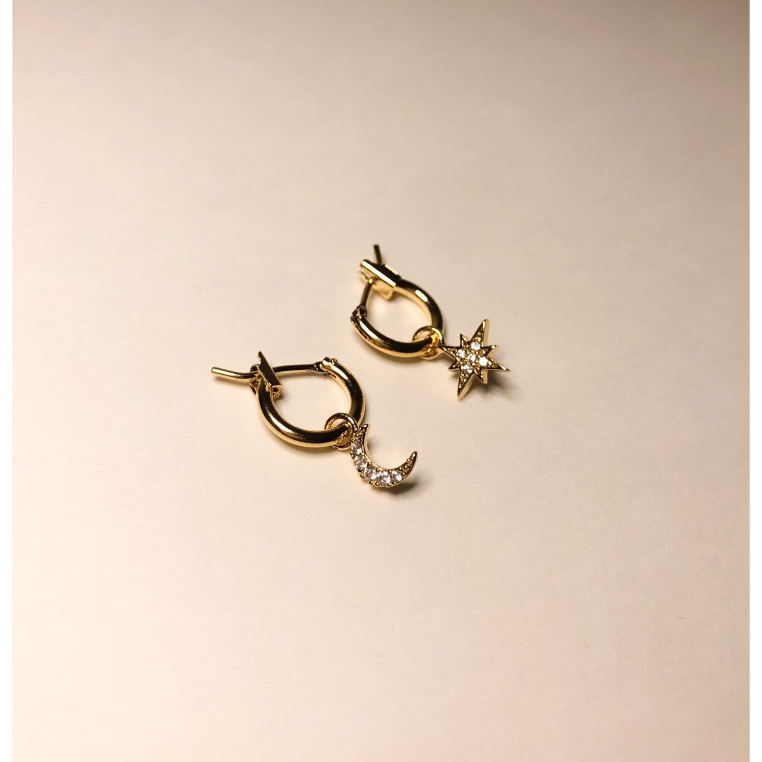 Details: Star and half moon shape cz paved dangling charm in mini hoop earrings with clip closure.