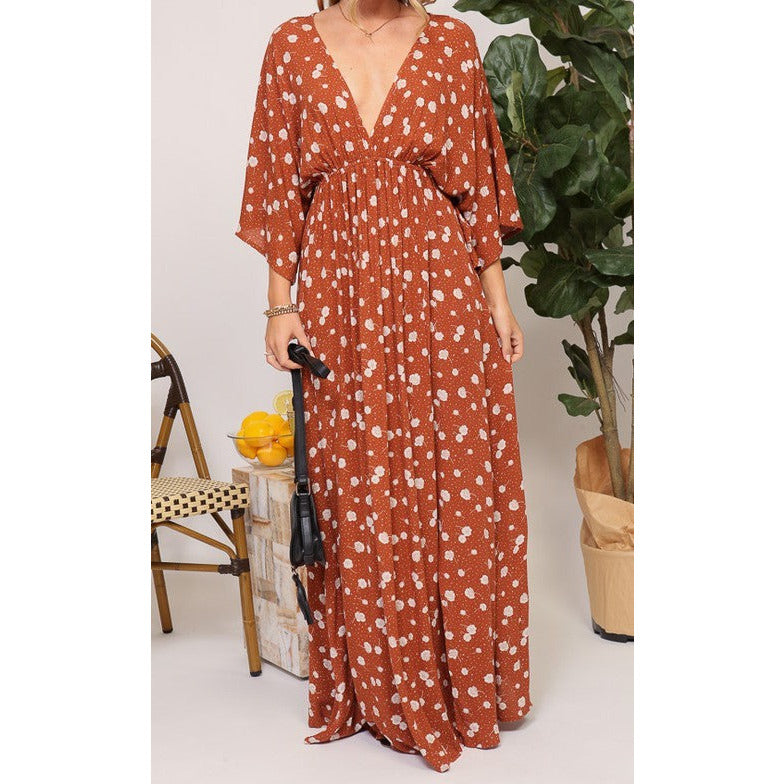 Details: High Low Sleeve, Low V-Neck Maxi Print Dress w/Elastic Waist and Front Slit