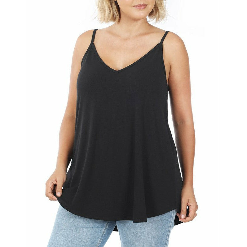 Details: V-Neck/Scoop-Neck, Front & Back Reversible Spaghetti Strap Soft Cami Tank. PLUS SIZE.